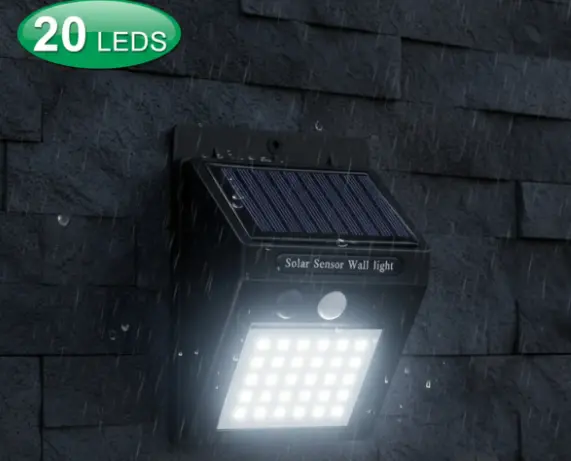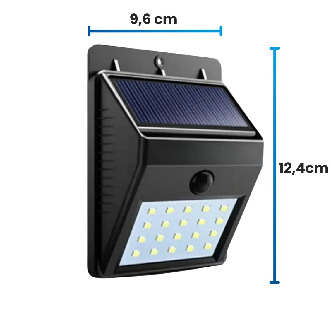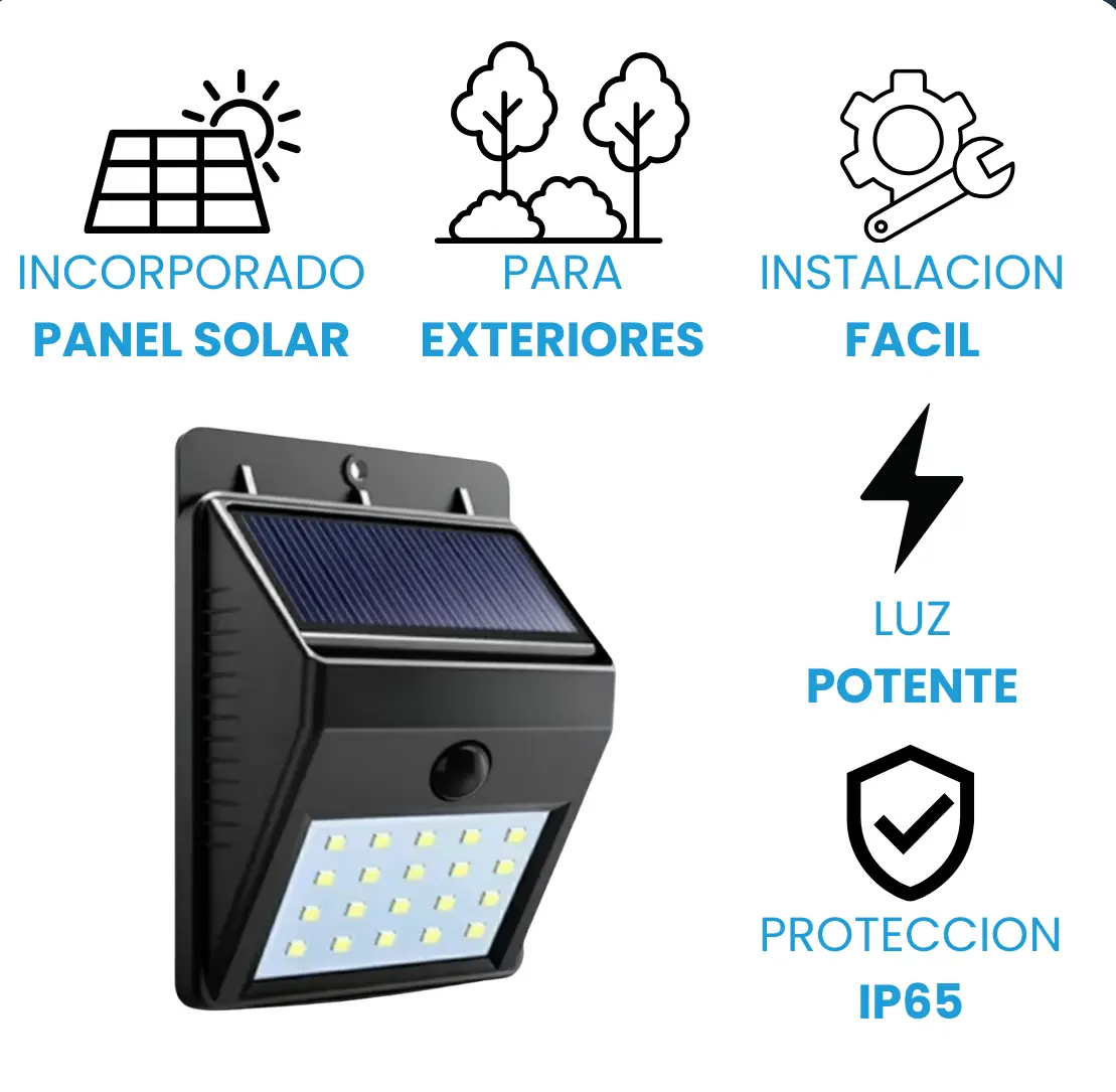 🔋 Se carga con energía solar 🌧 Resistente a la lluvia 🚶 Se activa automáticamente con movimiento ⚡ Iluminación potente de 20 LEDs